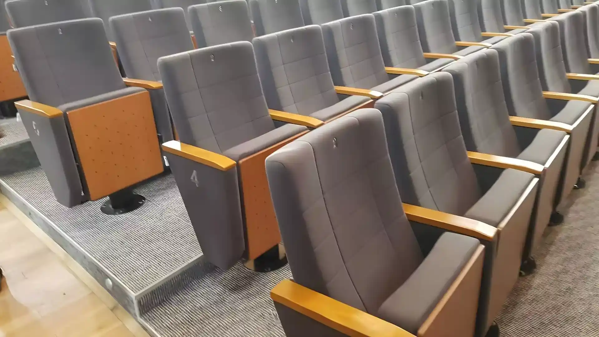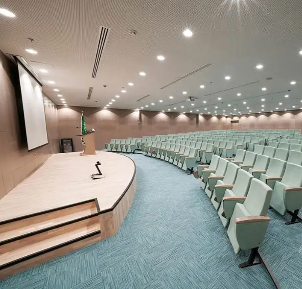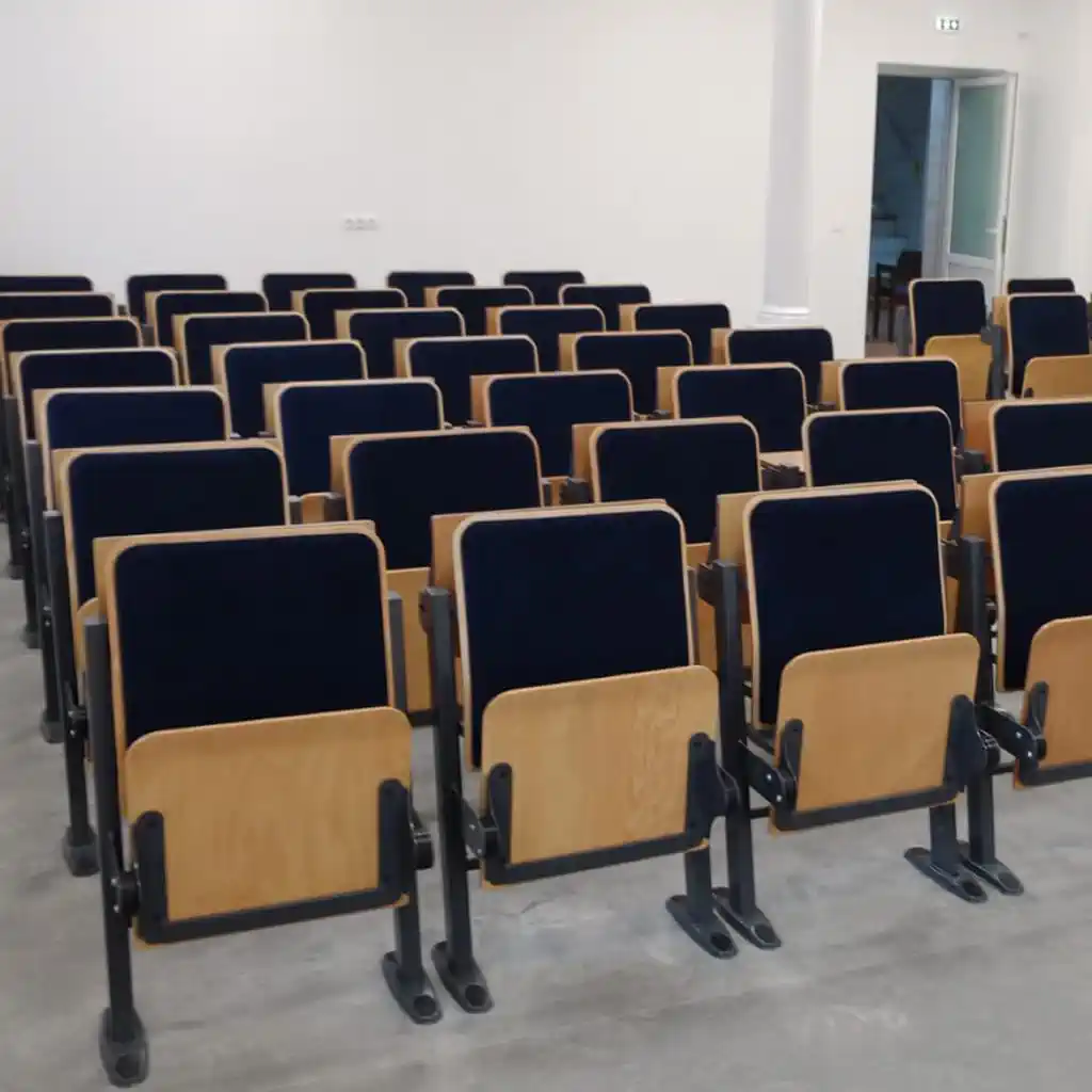 In the field of auditorium and conference seating, we offer certified fire-retardant models with optional wooden armrests, writing tablets, and space-saving folding mechanisms.